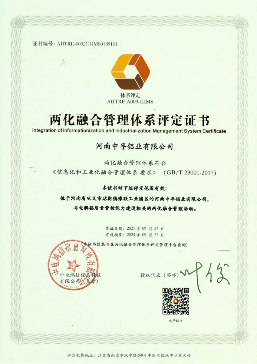 日前,中孚铝业公司获得了由国家工信部核定、授权评定机构颁发的《两化融合管理体系评定证书》,标志着中孚铝业公司在推进信息化和工业化融合方面取得了显著成效。