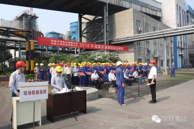 中孚电力公司、河南九龙公司、集团公司保卫处等单位200余人参加了实战演练。上午9时30分,中孚电力公司液氨罐区升起一缕浓烟,警报响起,现场巡视的工作人员立即汇报:“在卸氨作业期间,卸载臂与液氨车接头发生脱落,发生液氨泄漏,脱硝值班员因吸入氨气中毒晕倒。”公司应急领导组接到汇报后作出指示:“立即启动应急救援预案,组织人员抢险!”